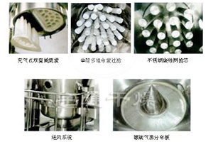 將制粒用的粉末物料放入流化床內(nèi),物料粉末粒子在原料容器中呈環(huán)形流化狀態(tài),受到經(jīng)過凈化后的加熱空氣預(yù)熱和混合,將粘合劑溶液霧化噴入,使若干粒子聚集成含有粘合劑的團(tuán)粒,由于熱空氣對(duì)物料的不斷干燥,使團(tuán)粒中水分蒸發(fā),粘合劑凝固,此過程不斷重復(fù)進(jìn)行,形成理想的、均勻的多微孔球狀顆粒。