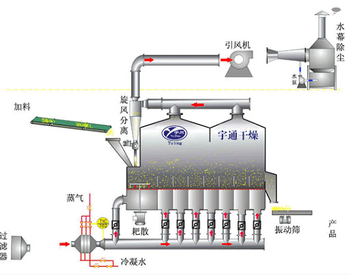 散粒狀固體物料由加料器加入流化床干燥機(jī)中, 潔凈的熱風(fēng)經(jīng)閥板分配進(jìn)入床體內(nèi),從加料器進(jìn)入的濕物料被熱風(fēng)形成沸騰狀態(tài)。由于熱風(fēng)與物料廣泛接觸,增強(qiáng)了傳熱傳質(zhì)的過程,因此在較短時(shí)間內(nèi)就可干燥。物料從床體的一頭進(jìn)入,經(jīng)過幾十秒至幾分鐘沸騰干燥后由排料口排出, 廢氣由沸騰床頂部排出經(jīng)旋風(fēng)除塵器組和布袋除塵器回收固體粉料后排空。