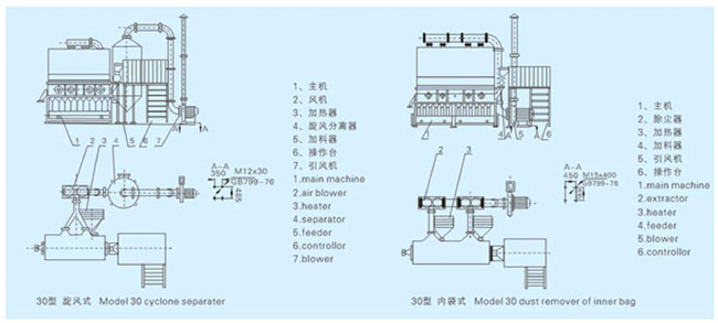 XF系列臥式沸騰干燥機(jī)又稱流化床或者沸騰床,它是由空氣過濾器、沸騰床主機(jī)、旋風(fēng)分離器、布袋除塵器、高壓離心通風(fēng)機(jī)、操作臺組成。由于干燥物料的性質(zhì)不同,配套除塵設(shè)備時(shí),可按需要考慮,可同時(shí)選擇旋風(fēng)分離器、布袋除塵器,也可選擇其中一種。一般來說,比重較大的沖劑及顆粒物料干燥只需選擇旋風(fēng)分離器。比重較輕的小顆粒狀和粉狀物料需配套布袋除塵器,并備有氣力送料裝置及皮帶輸機(jī)供選擇。蒸氣、電、熱風(fēng)爐均可配用(按用戶要求配套)。